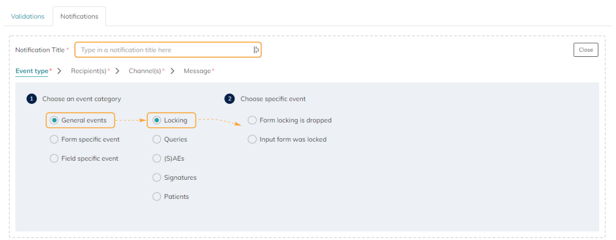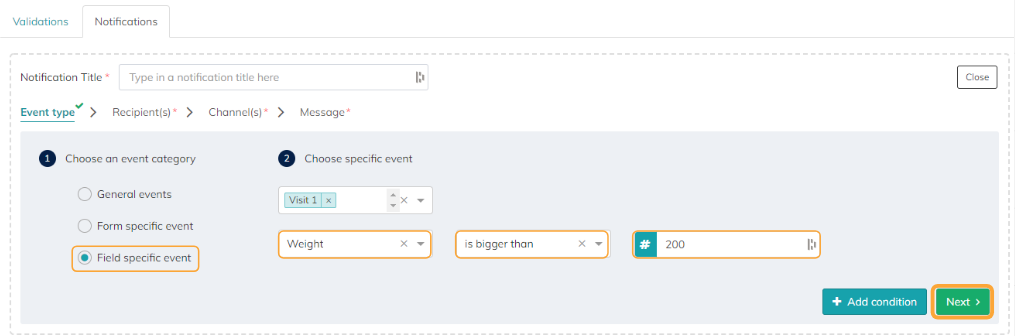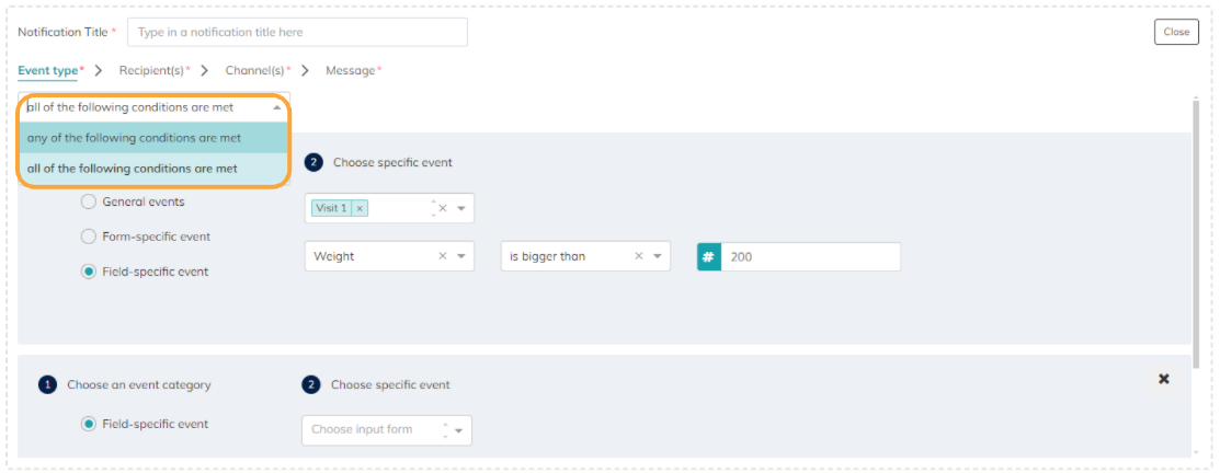 c.Under "Field specific event" you can set a field-specific notification. First, select the input form in which the field was inserted. Second, select the respective field (e.g. weight). Third, if applicale for your use case, select a comparison type (e.g. is bigger than) and enter the desired property (e.g. 120).