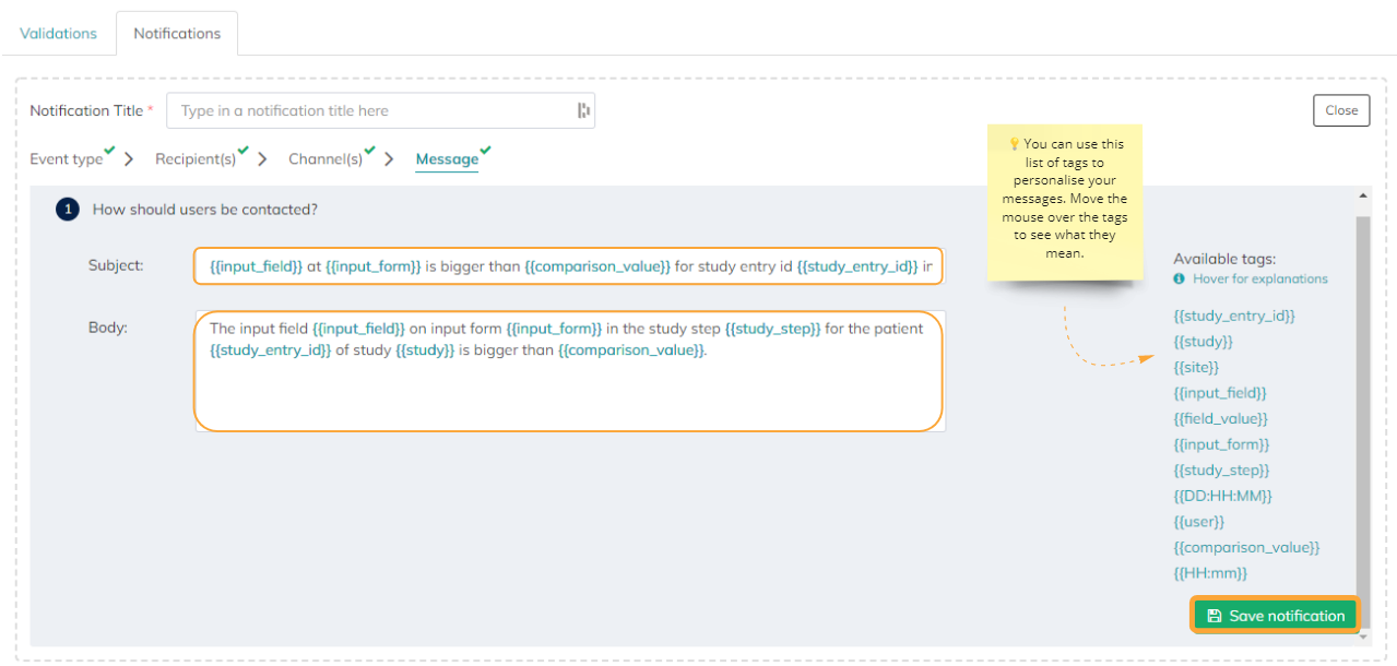 6.Last but not least, you can customise your message in the next tab ("Message"). You can use dynamic text variables ("tags") as shown in curly brackets and in the box next to it.