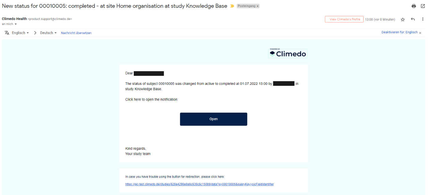 b.If you select "via e-mail", you will receive an email from product.support@climedo.de as soon as the trigger is set. A possible notification email could look like this: