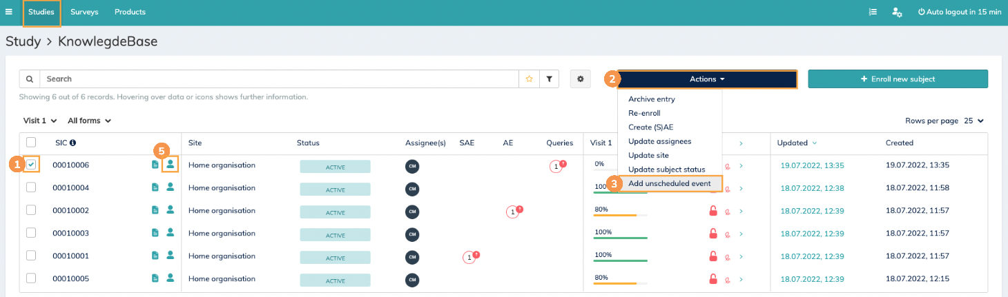 What is considered as an unscheduled event? Depending on the set up of the study this is usually an event that happens out of the ordinary protocol of the study. This could include any additional important data about the subject e.g. blood samples, medical history, medication. Please keep in mind that you need update rights for unscheduled events to add them to a subject. |