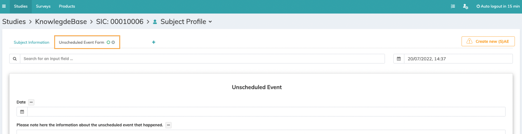 ➕ In addition to filling out a form for an unscheduled event you can also upload a file for a subject. Go to the tab "subject information" to do so. Read here more about this topic: Subjects profile. |