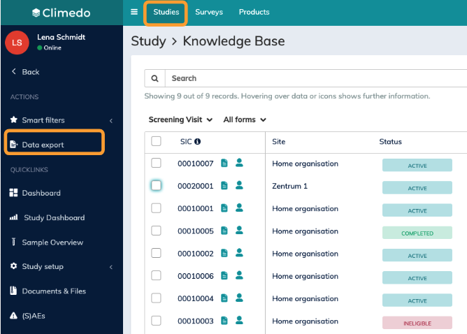 ⭐ Option 1: click on the button "Data export" on the left sidebar from anywhere you are in the study ➡️ A window will pop up where you can choose the data you want to export. ⭐ Option 2: in the subject or (S)AE overview select the subjects or (S)AEs you wan to export by checking the boxes in front of the SIC, then select "Data export" on the left sidebar. ➡️ This way the pop-up window will be prefilled. |