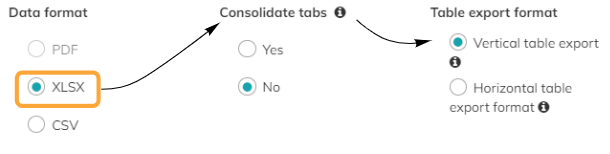 XLSX gives you the option to consolidate tabs (see below) which gives you a more compact version of the data. In addition, you have the option, in the case of table use in the EDC system, to export this as a vertical table. Please note that in this case the table appears in a separate tab in the export. The name of the tab corresponds to the export label of the table. | ![]() | |