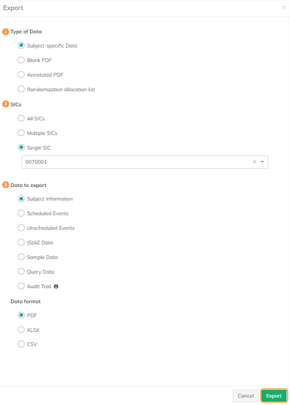 ![]() | SICs: If you have chosen to export subject-specific data, then you are able to select the subjects via the SICs. You can select all SICs, multiple or single ones. | |