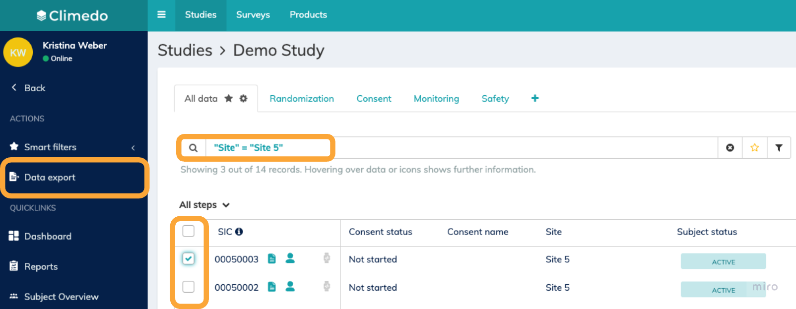 Option 1: General Data Export Click the "Data export" button in the left sidebar from anywhere within the study. A pop-up window will appear where you can select the specific data you want to export. Option 2: Pre-selected Subject Export In the subject or (S)AE overview, select the subjects or (S)AEs you want to export by checking the boxes next to their SIC numbers. Then click "Data export" in the left sidebar. The pop-up window will automatically be pre-filled with your selected subjects. Option 3: Filtered Data Export When you have active filters applied in the search bar of the subject overview, clicking "Data export" will only download data for subjects that match your current filter criteria. This applies to both scheduled events data and consent data. Option 4: Context-based Export The export scope will be automatically pre-filled based on your current location in the system. For example, if you're viewing a specific subject's eCRF, the export will default to that single subject. |