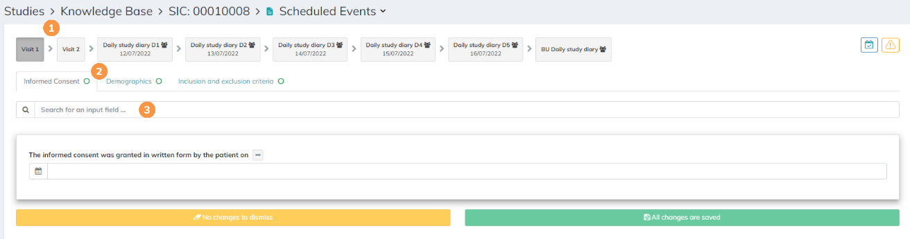When clicking on the sheet icon () next to the SIC in the subject overview you are taken to the steps and forms of the "Scheduled Events", which are the forms of your study (including ePRO steps if implemented).