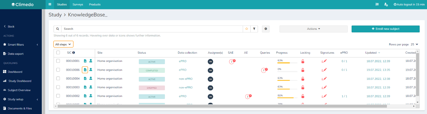 After a subject has been enrolled into the system, the data entry screen for this patient opens automatically. If you want to enter data for the respective subject again, click on the sheet icon ("open scheduled events") next to the SIC.