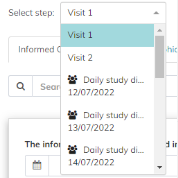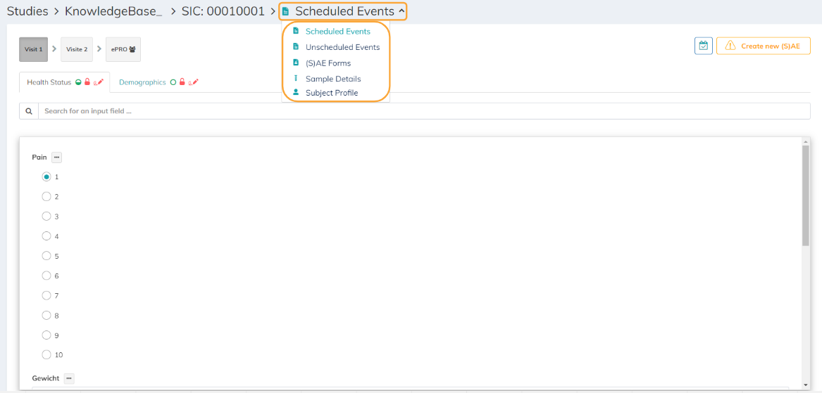 Here you also have the option (if applicable for your study) to switch between the different areas: Unscheduled Events, (S)AE Forms, Samples, Subject Profile and Wearables (depending on the activated modules for your study). To switch to another area, click on the arrow next "Scheduled Events" in the top bar. A drop-down list opens. Here you can select the different areas, like the subject profile. Read the following articles for more information regarding the subject profile and the (S)AE module: