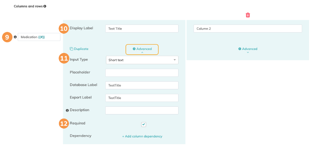 ![]() | Click on "Advanced" to open the column settings and add a column label (Export- and Database label will be set automatically). |