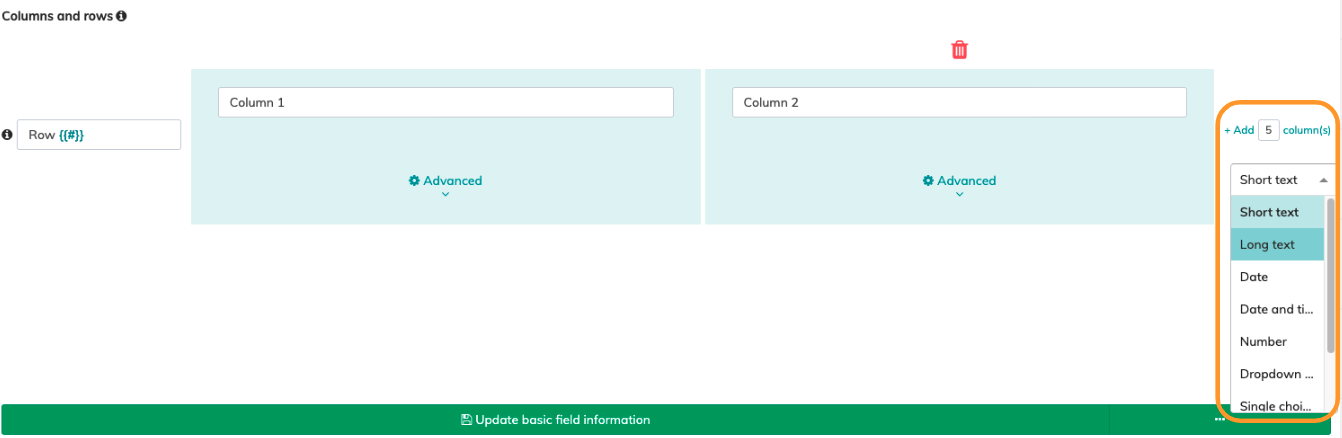![]() | Select the column input field data type, such as numbers, short text or date etc. ❗The Slider field type is only available for the repeating fields view, not for the table view. If you change from repeating fields to table input field view, make sure your selected slider input field is in one of your columns. Remember to change it to another available input field type first. |