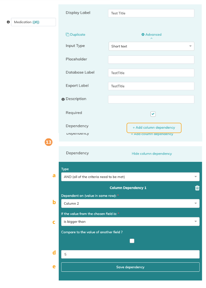b. Choose which other column this column is dependent on. c. Select a dependency condition. d. Add the value which the input field value shall be compared to e. Remember to save the dependency Add an additional dependency condition if required and repeat steps a. – d. again. Please refer to the article for further information regarding field dependencies: How do I set up dependencies within an input form? (Step 3) |