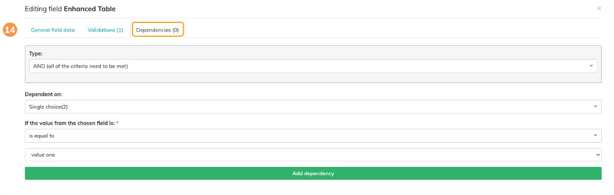 ![]() | Optional: Set input field dependencies Follow the same steps in step 13, with the only difference that you select an input field outside of the table which the entire table will be dependent on. |
