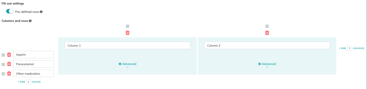 ![]() | Optional: Add a custom naming logic to your rows, e.g. "Medication #". ⭐ Good to know: If you remove the enumeration tag (#), the system will automatically add counting to your rows to make them identifiable in the audit trail. |