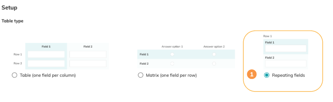 Use the Repeating fields setting in the Table type selection to make a group of questions repeatable and show them as separate input fields instead of a table.