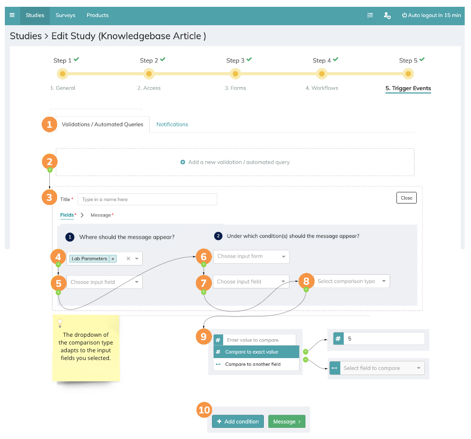 ![]() | Go to the study editing mode and select the 5th step: "Trigger events". Stay within the first tab "Validations / Automated Queries". |