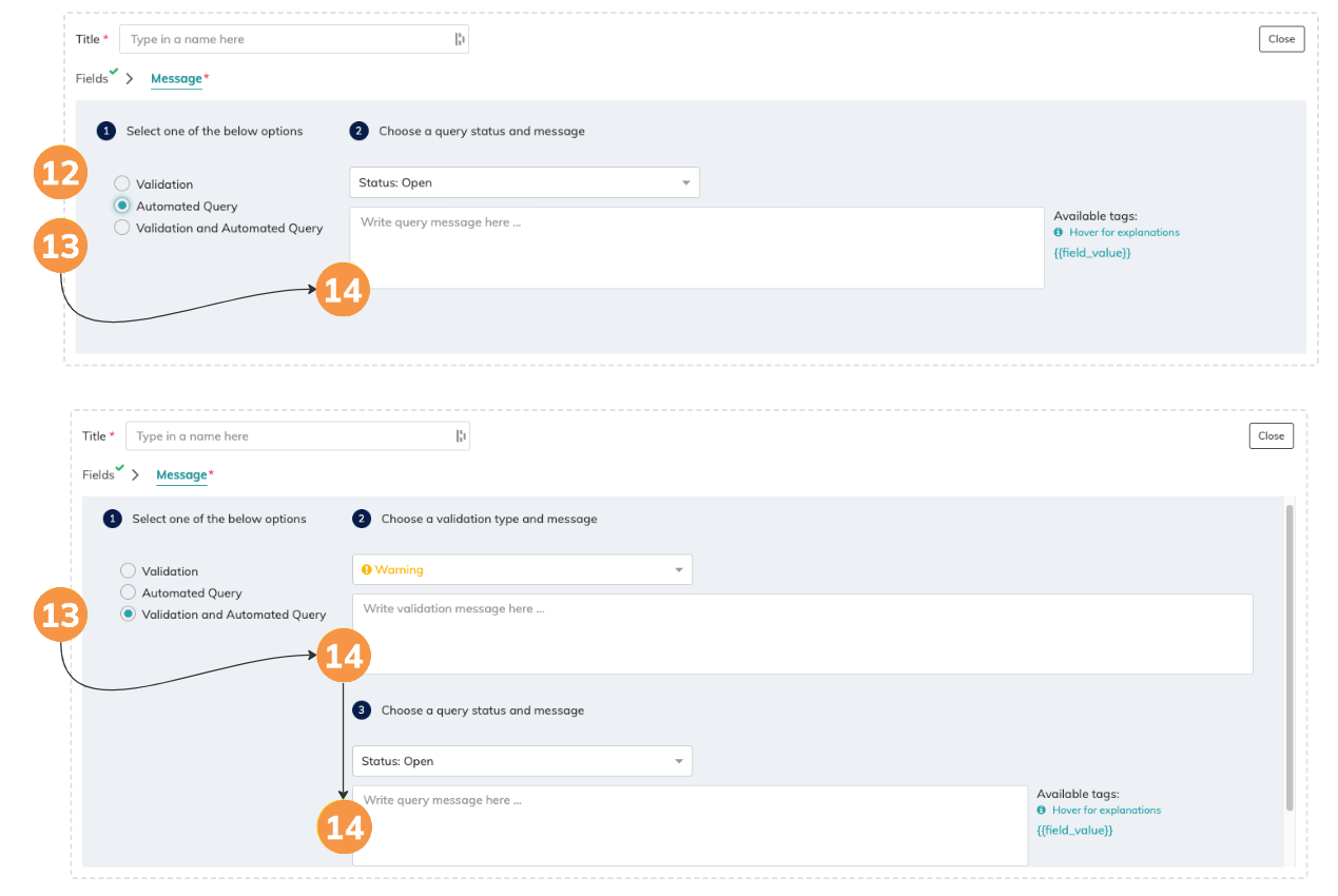 ![]() | If you select Validation and Automated Query, first choose a validation type and message for the validation to show in the field. | |