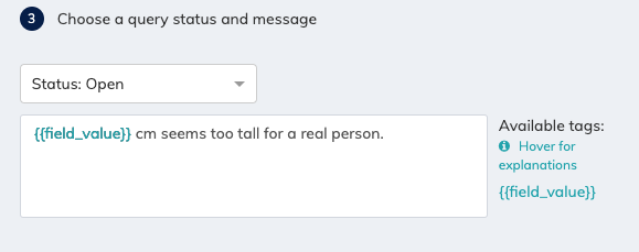 ![]() | Consequently you choose a query status and message. To make your message more comprehensive, it is possible to add a tag called 'field_value' to refer to the specific field value the user has entered inside your message. Remember to save your changes. | ![]() |