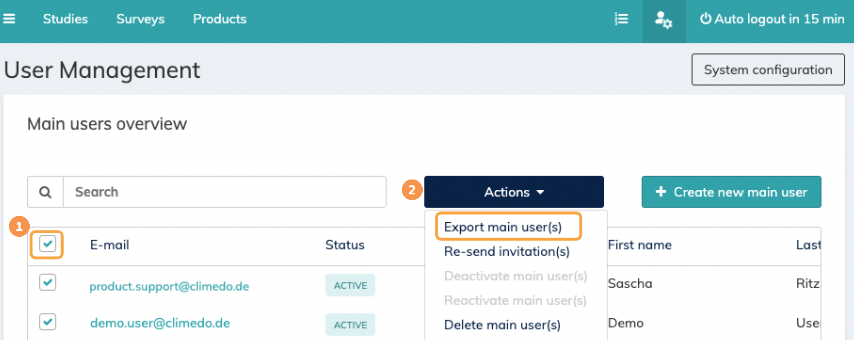 ![]() | Then go via the "Actions" button and select export main user(s). The download will automatically start within your browser and an XLSX file will open. |