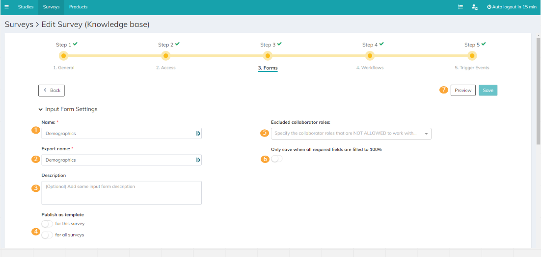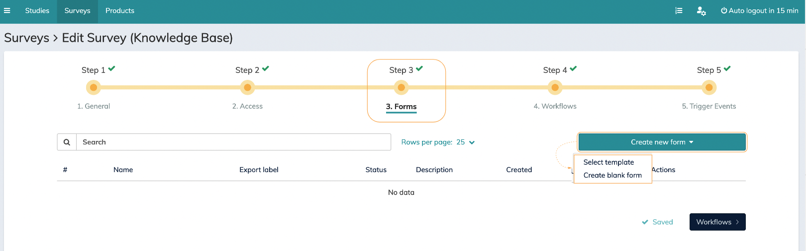 In Step 3 "Forms" of creating your survey, you can set up your input form. Click on "Create new form". Now you have two options: