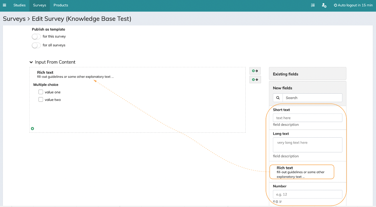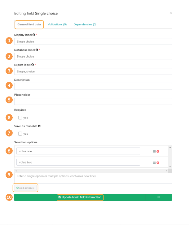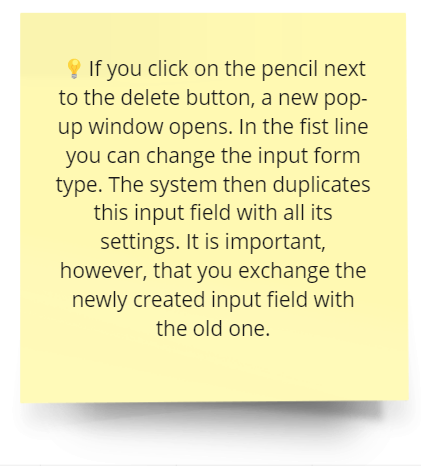 ![]() | For the input field types "Single Choice", "Multiple Choice" and "Dropdown List", the first two selection options are entered by the system as examples. You can delete this text and enter you own options. | |
