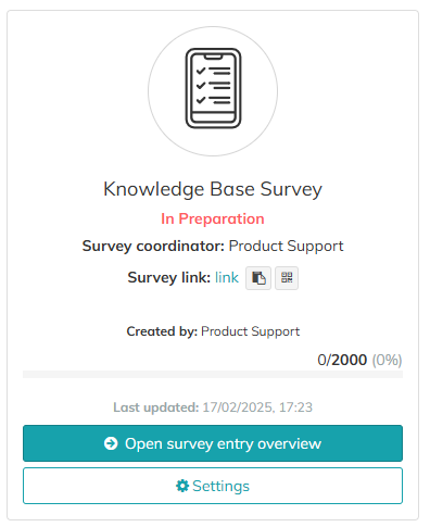 Here you can change the status of your survey. While you are still in the initial setup phase of the survey, it should be set to "In Preparation". During the User Acceptance Test, you can set the status to "Testing". When the survey is set up to go live you can select "Active". Please note, once the survey is activated, you cannot revert its status to "In Preparation" or "Testing." However, if you need to make updates while the survey is active, you can create a sandbox environment to implement and test your changes before publishing them to the active survey (find details here).