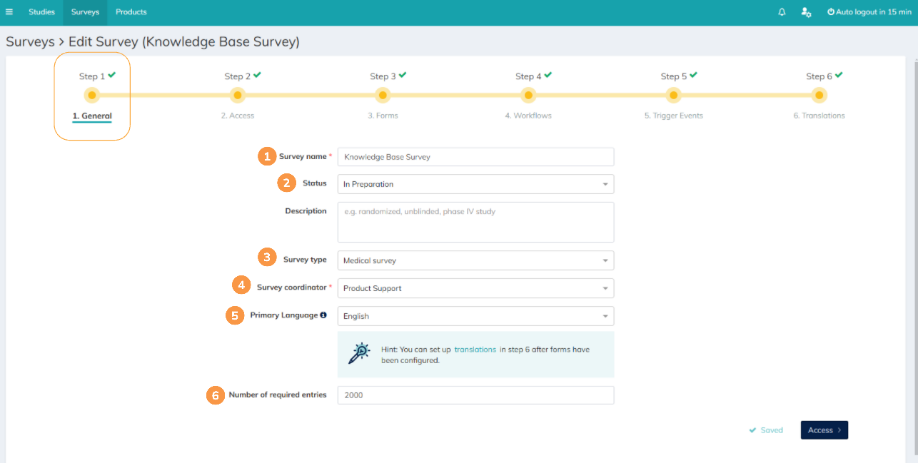 After you have clicked on "Create new survey", a new window will open. In the first step (1. General) you will be asked to provide general information about your survey.