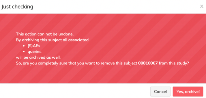 Archive entry: If you are archiving a subject entry, a warning message will appear: Archiving entries will also archive all associated (S)AEs and queries! Archiving entries will be shown in the audit trail. Please note: If the patient to be archived is the last patient created for the respective so far, the consecutive patient number is skipped when a new patient is created. Example: Patient 00010024 is archived. The next patient receives the SIC 00010025. | ![]() | |