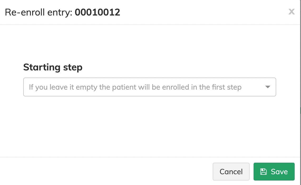 Re-enroll (similar to re-screen): If you click on "Re-enroll" then you will be asked to choose a starting step for your subject. If you leave this field empty then your subject will be enrolled in the first step. | ![]() | |