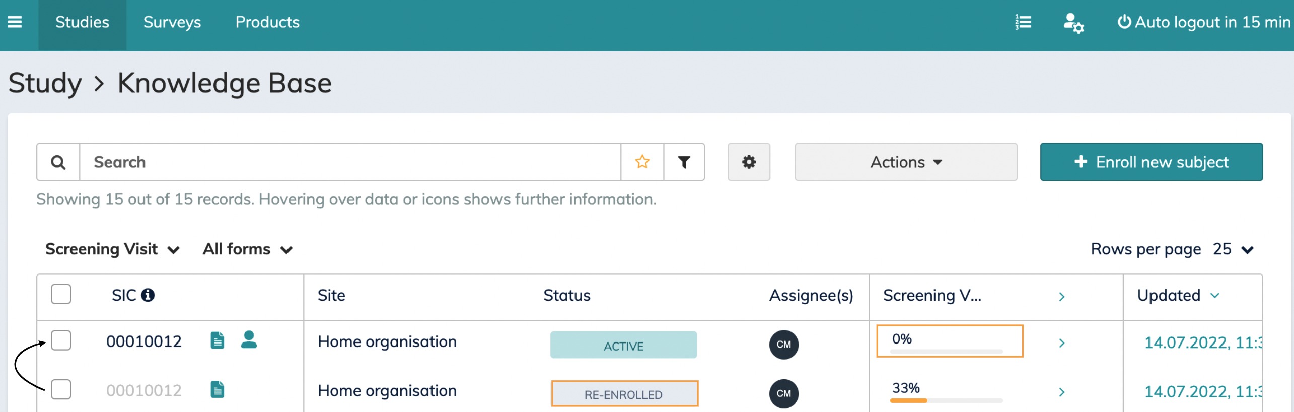 ⭐ If you are re-enrolling a subject, the SIC will stay the same, but you freeze all data entered so far (status will change to "re-enrolled") and a "fresh version" of this subject will be created with the same SIC and the status "active" but no data entered so far. For the "old" version of the subject called with the status "re-enrolled" the following applies: ✅ You can still lock & sign forms ✅ Creating and updating of queries is possible ⚠️ The data of re-enrolled subjects cannot be edited anymore ⚠️ You cannot export data as PDF This is what the action of re-enrolling will look like: |
