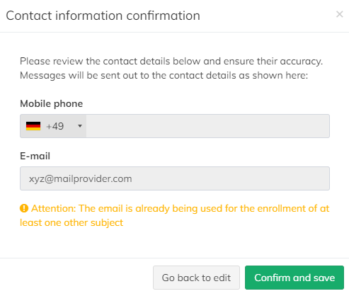 The first enrolling of a subject with the email address works as usual. If you now enter the same email address for the second or all subsequent subjects, you will receive a warning message from the system confirming that the same email address has already been used for another subject. If the premium feature "one device enrollment" is enabled, you can click on "Confirm and save". The subject will be enrolled in the system. | ![]() |