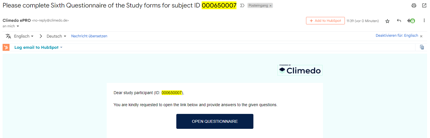 For a better distinction of the respective sent emails and/or SMS for the ePROs, the SIC (subject identification code) is displayed in the subject as well as in the text message itself. | |