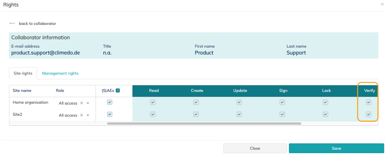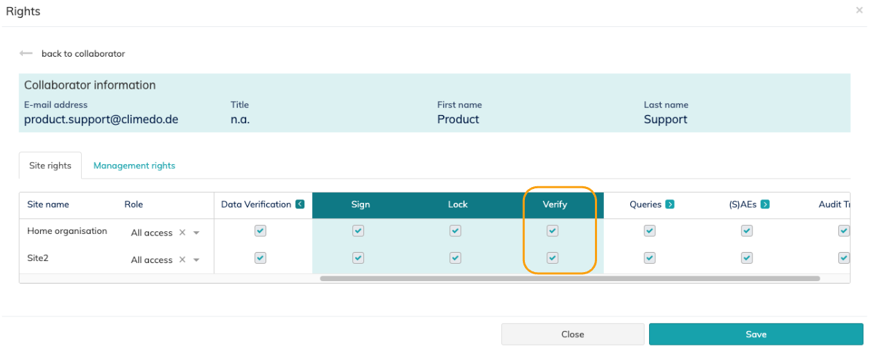 The right to setup the SDV feature is covered within the management right to update input forms & fields. The right to verify input field data, however, needs to be configured separately in the site rights of the collaborator in the study settings step 2.