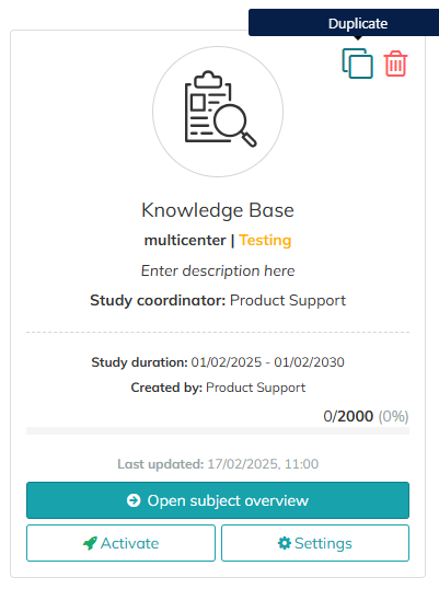 In your Studies Overview, click on the button showed above, near to the deletion button. This button appears when you hover over your study hand have the necessary management rights. A new window will pop up where you can update the name and the status of the new duplicated study. Also you will find all required information about default options as well as configuration options for this action.