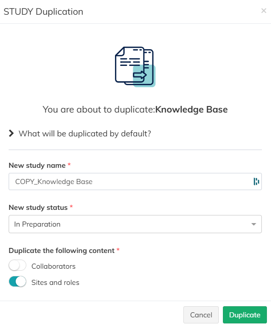 Sites and Roles: If toggled on, you will duplicate all existing sites and roles to the new study. Activating this option is necessary to duplicate collaborators as collaborators can only exist with assigned role(s) and site(s).