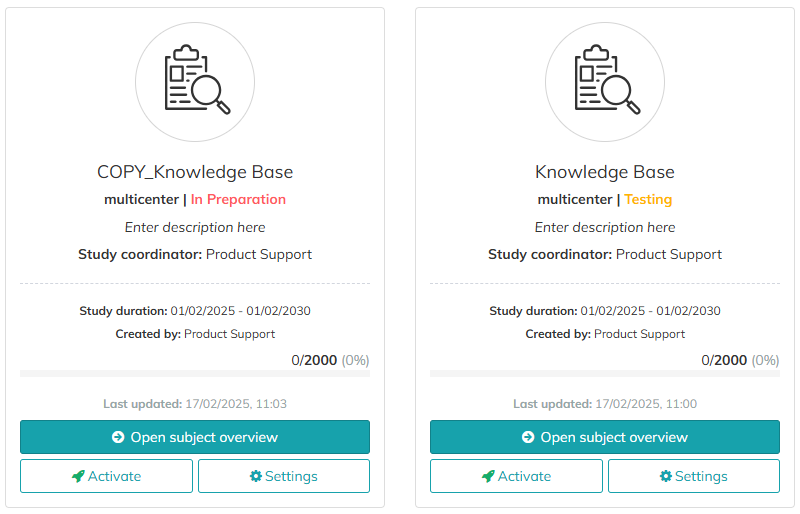 Duplicating a study and all its configurations can facilitate UAT preparations, amendment processes, as well as transitions from pilot studies to clinical trials.