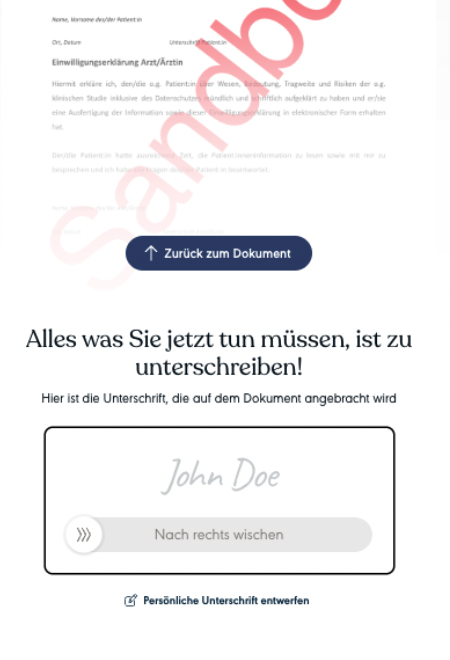 Depending on the chosen signature type, a two-factor authentication or a video ident process must be completed. In the below case of a simple signature, the signee simply needs to swipe right and his/her signature is automatically added.