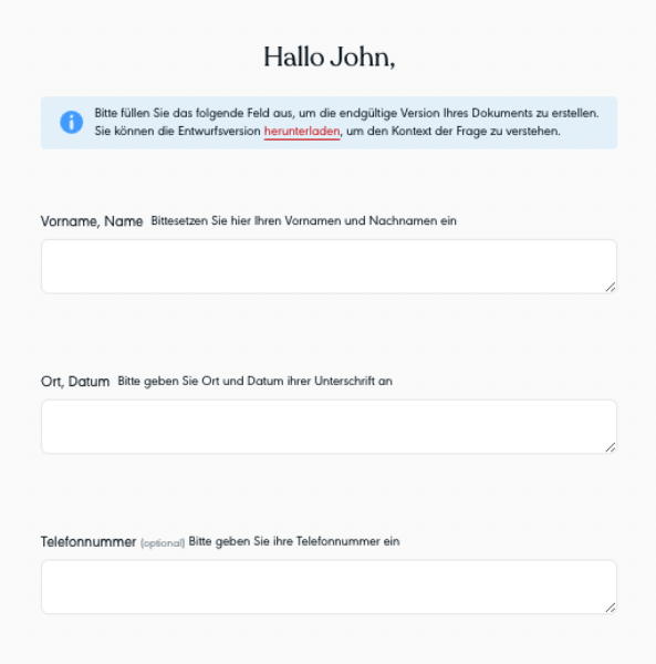After opening the link to start the signing process, the signees will at first have to fill in some pre-defined information that is required for the consent form. In this case, it is the first name, date and time of signature, phone number etc. which will then be added to the document.
