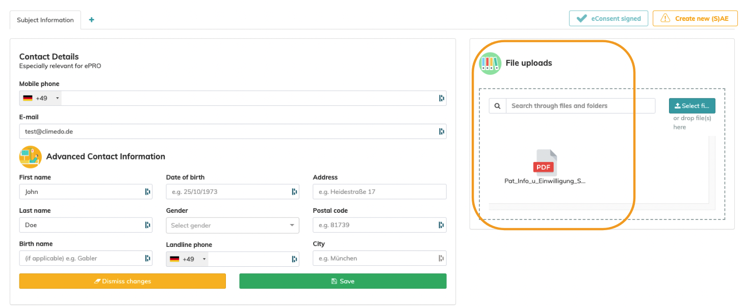 Once all parties have signed the eConsent and the status is set to "signed", the consent document will be automatically uploaded to the "File uploads" section of the respective subjects profile. The document can be viewed and downloaded by double-clicking on the file by any user who has the role right to read subject files.