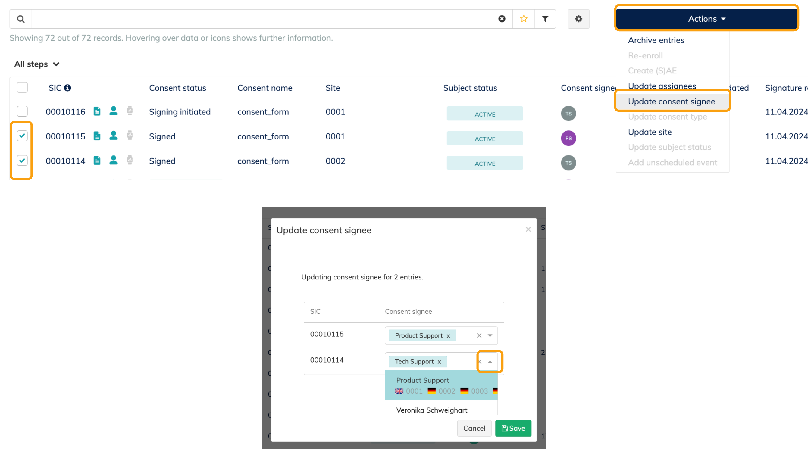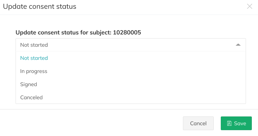 Please note: You can only update the signee when there is no eConsent signature process in progress for this subject. If you wish to change the signee for an eConsent with the status "signing initiated", you need to first cancel the process manually in the subject profile or the eCRF (see point 3).