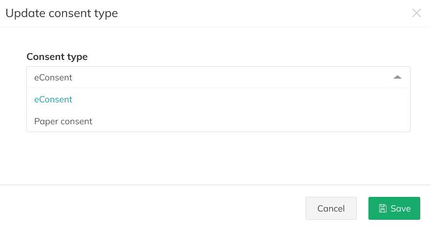 A new pop-up window opens. Here you can select and save the new consent type. In case of a change from eConsent to paper-based Consent, the button to start the eConsent process for a subject disappear from the eCRF and subject profile. | ![]() |