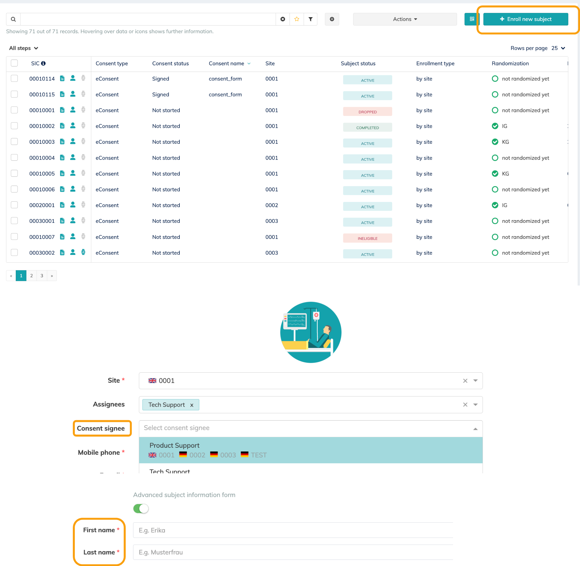 ⚠️ To successfully start the eConsent signing process, it is necessary to add the First name and Last name of the subject (upon enrolment). |