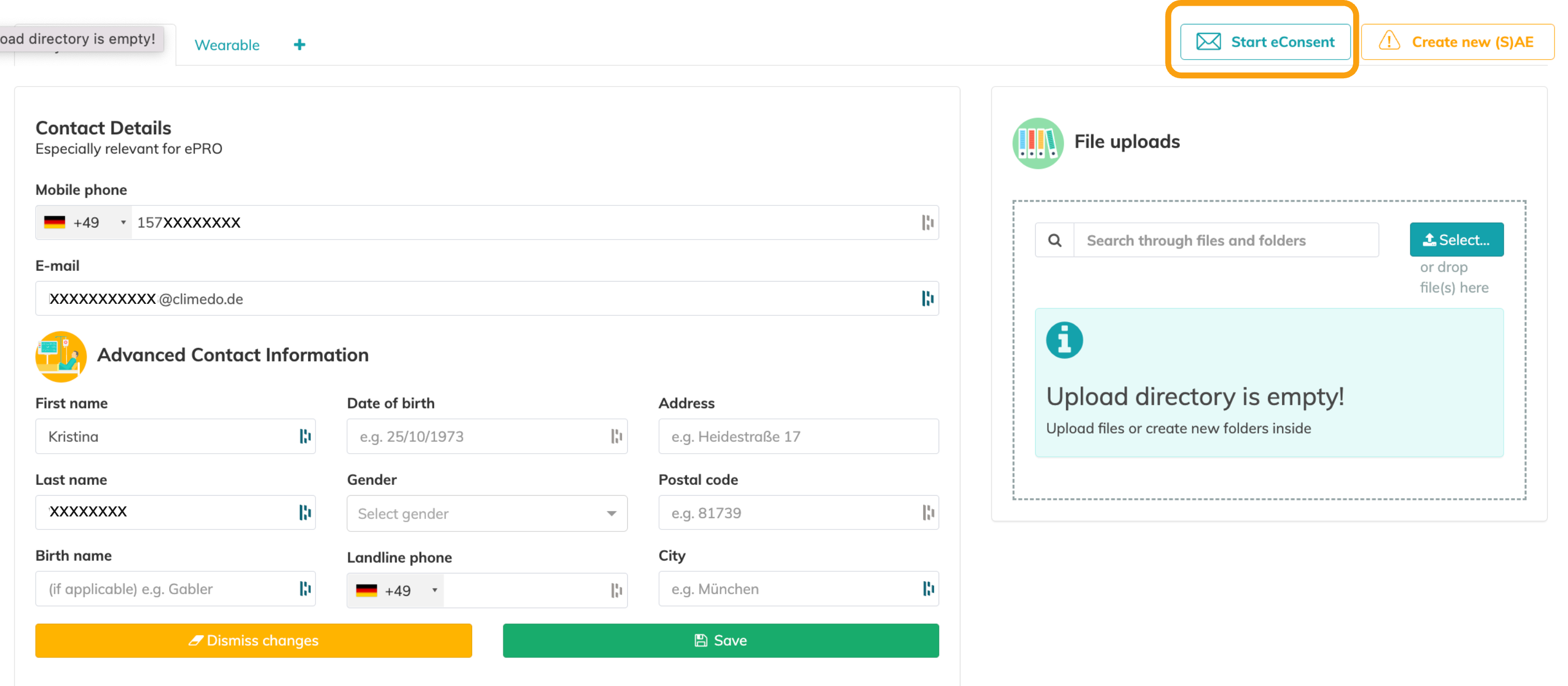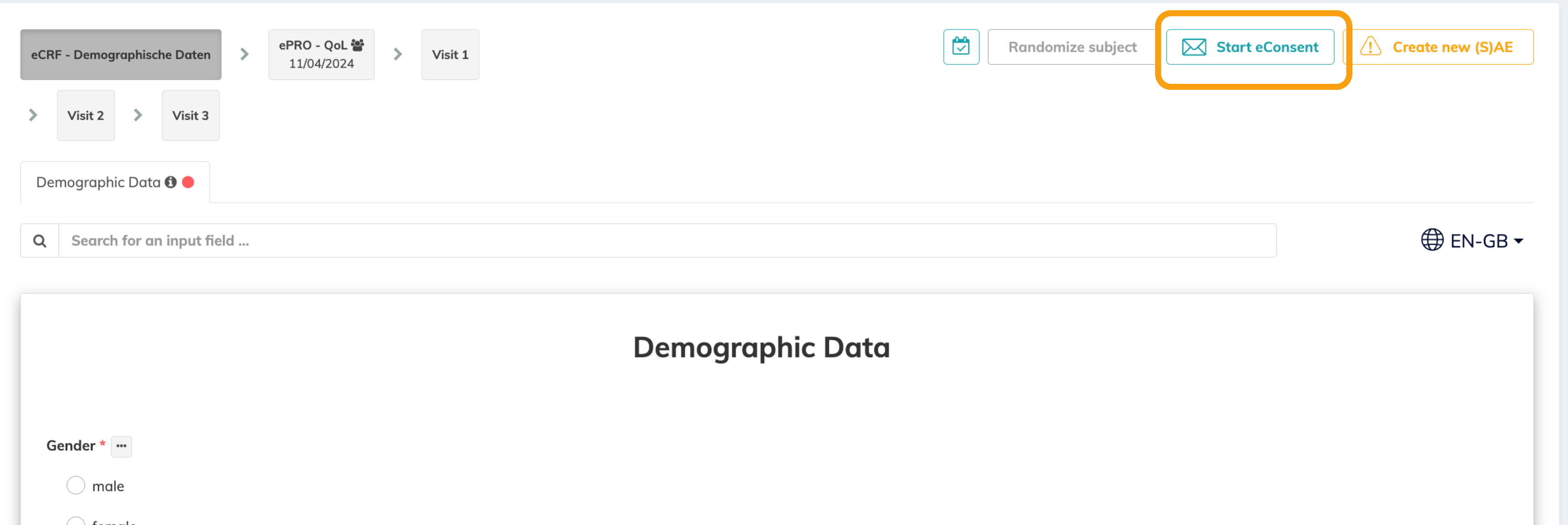 Triggering/sending of the signature request to subject and doctor via click on "Start eConsent" in the: | |