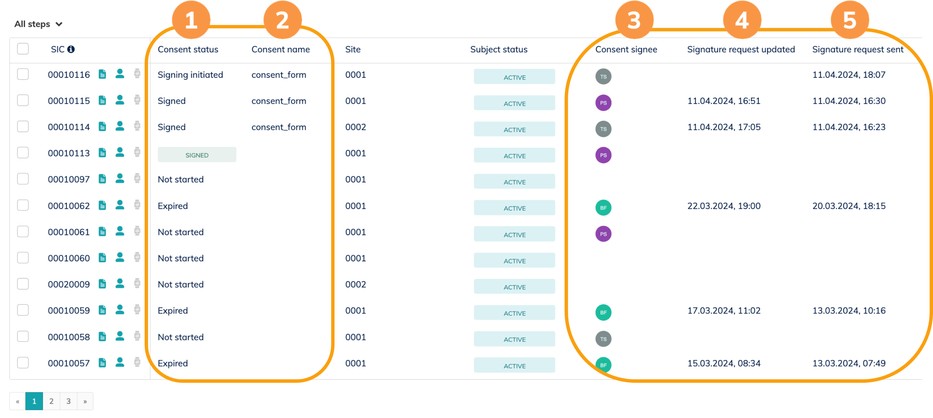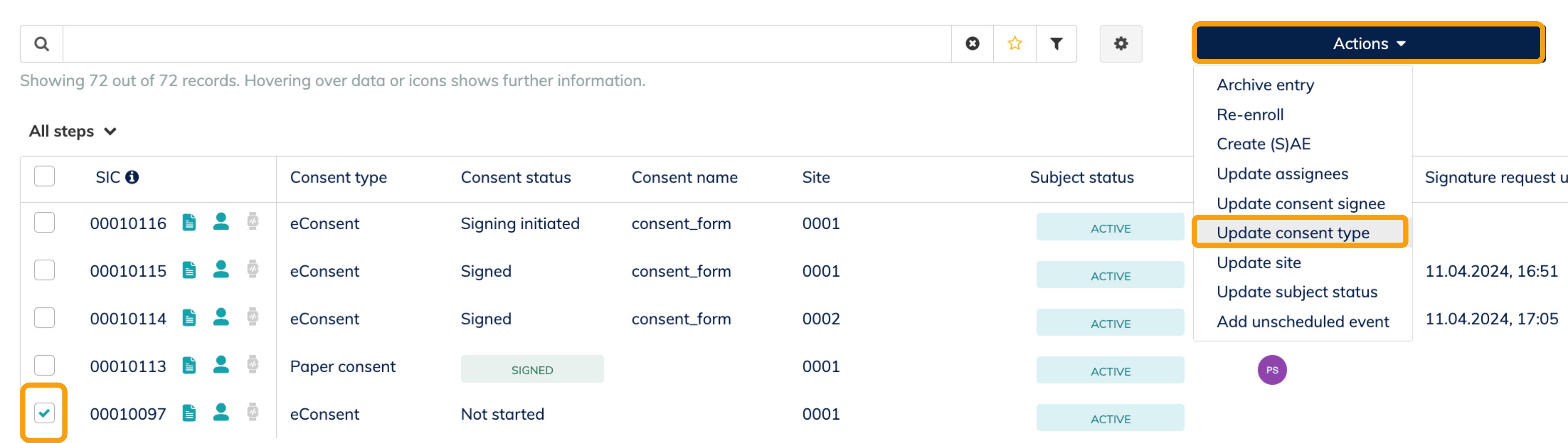In the subject overview you will find two relevant columns: "Consent Type" and "Consent Status". The "Consent type" column indicates whether the subject has been selected to complete the consent digitally or on paper. You can manually adjust the consent status for paper-based consents. The eConsent status is automatically adjusted by the system.
