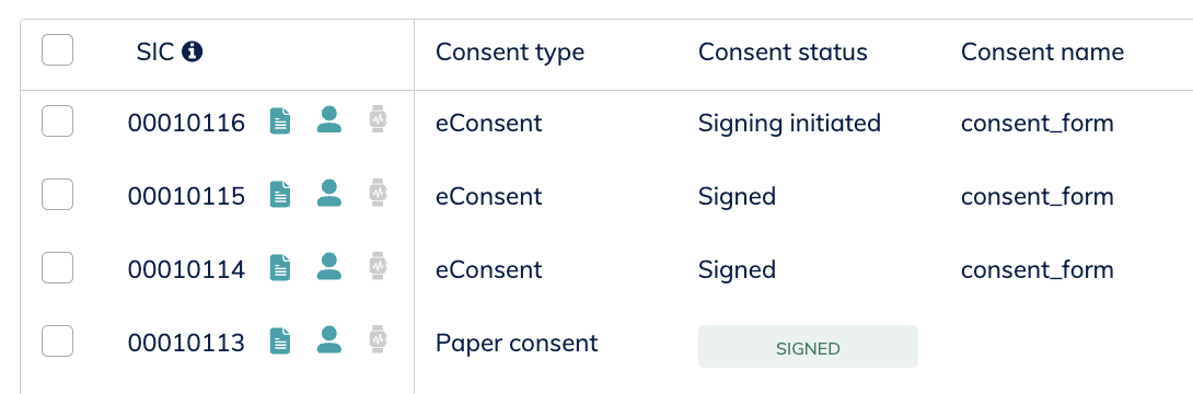 ![]() | The Consent name indicates which eConsent form has been triggered (and signed) for the respective subject. |