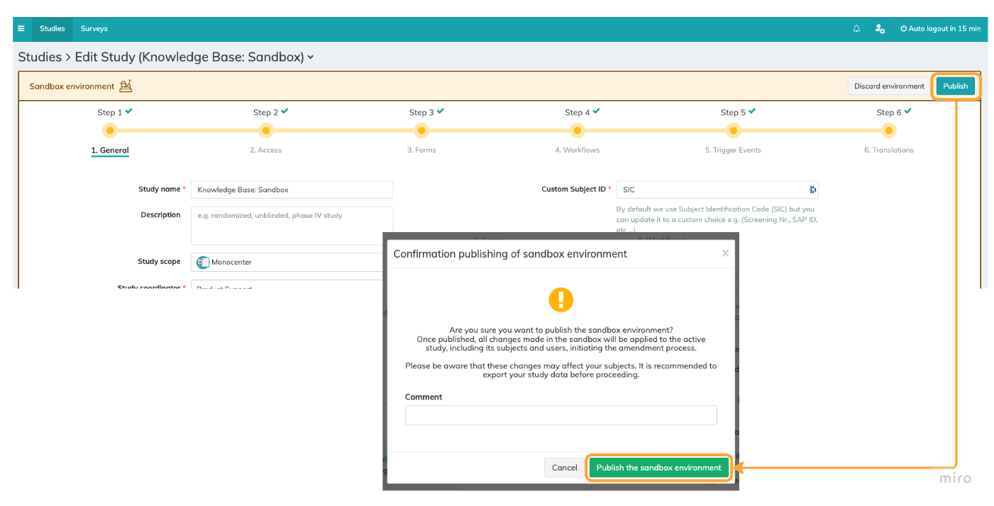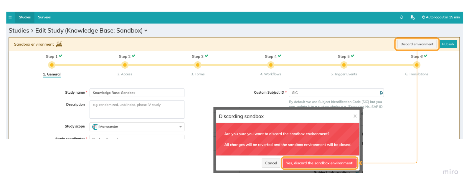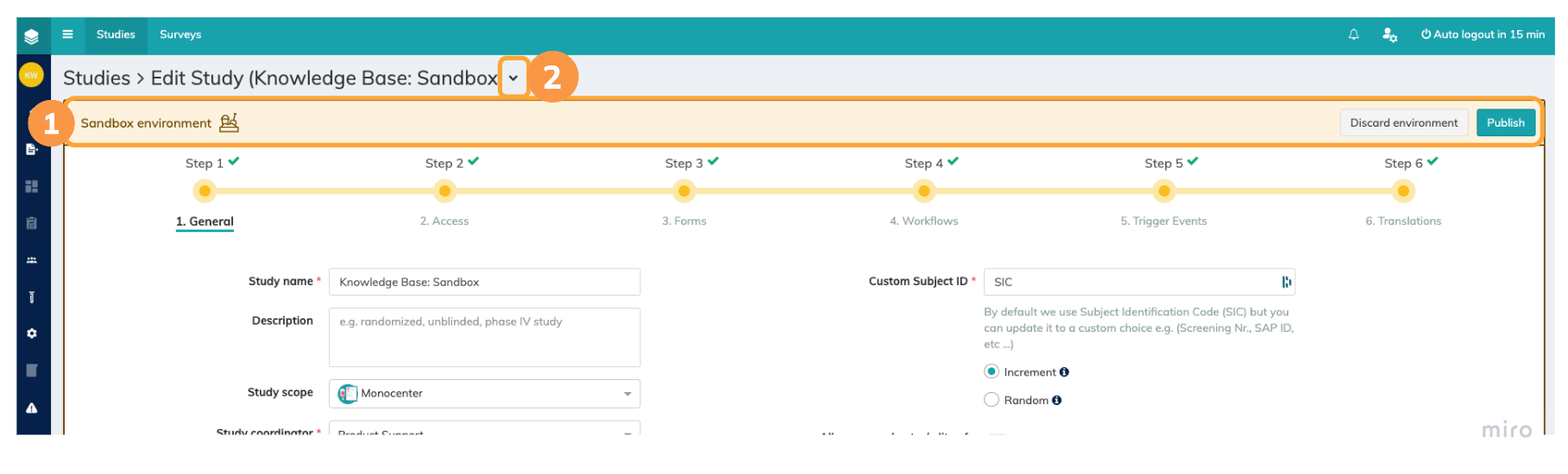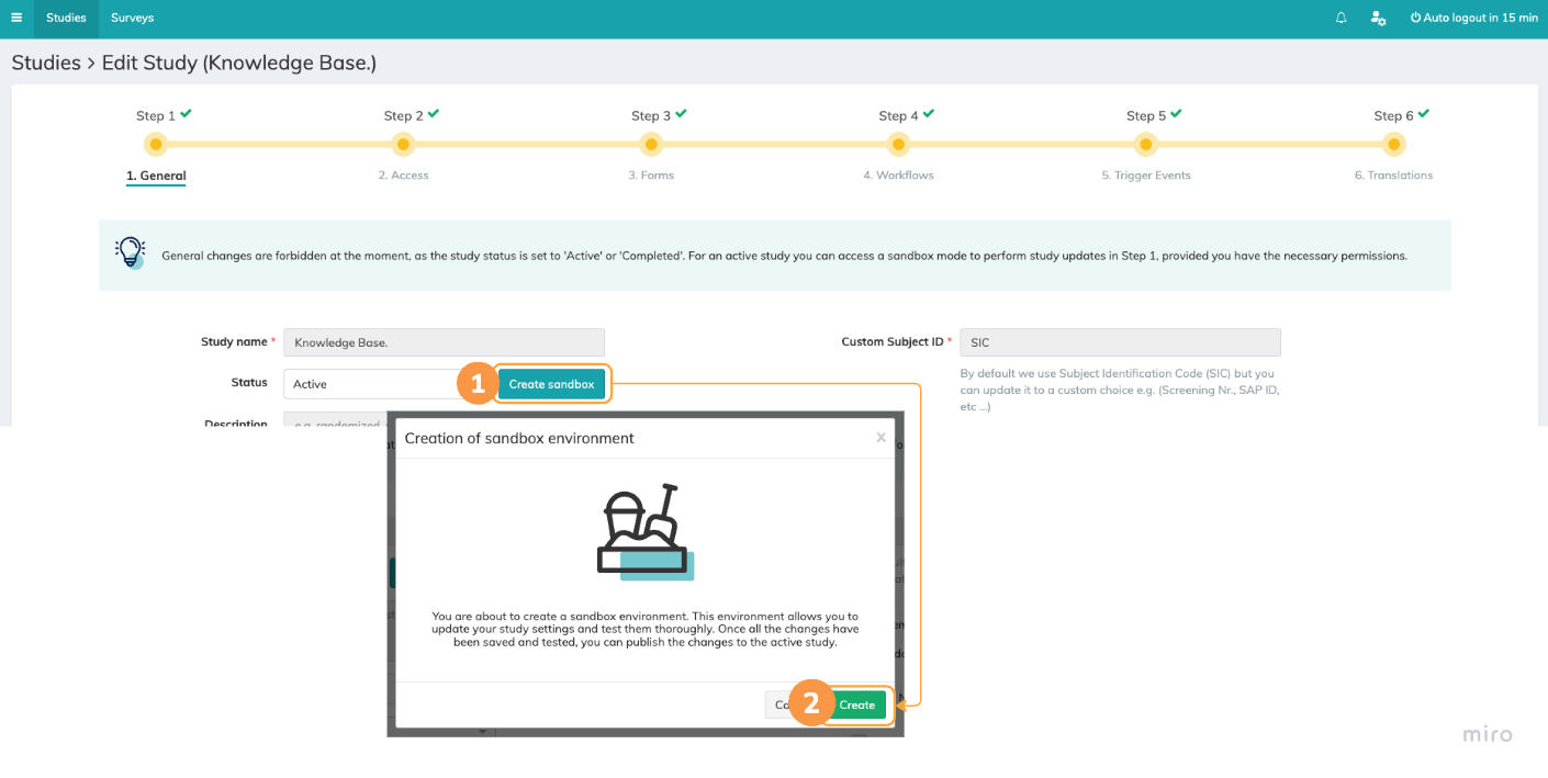 Good to know: A sandbox can be created at any time for an active project by collaborators with the appropriate management rights (Please refer to section 3 below!). It mirrors the settings of the active study, including all configuration steps such as 1. General, 2. Forms, 3. Access - Roles, 4. Workflows, 5. Trigger Events, and 6. Translations.