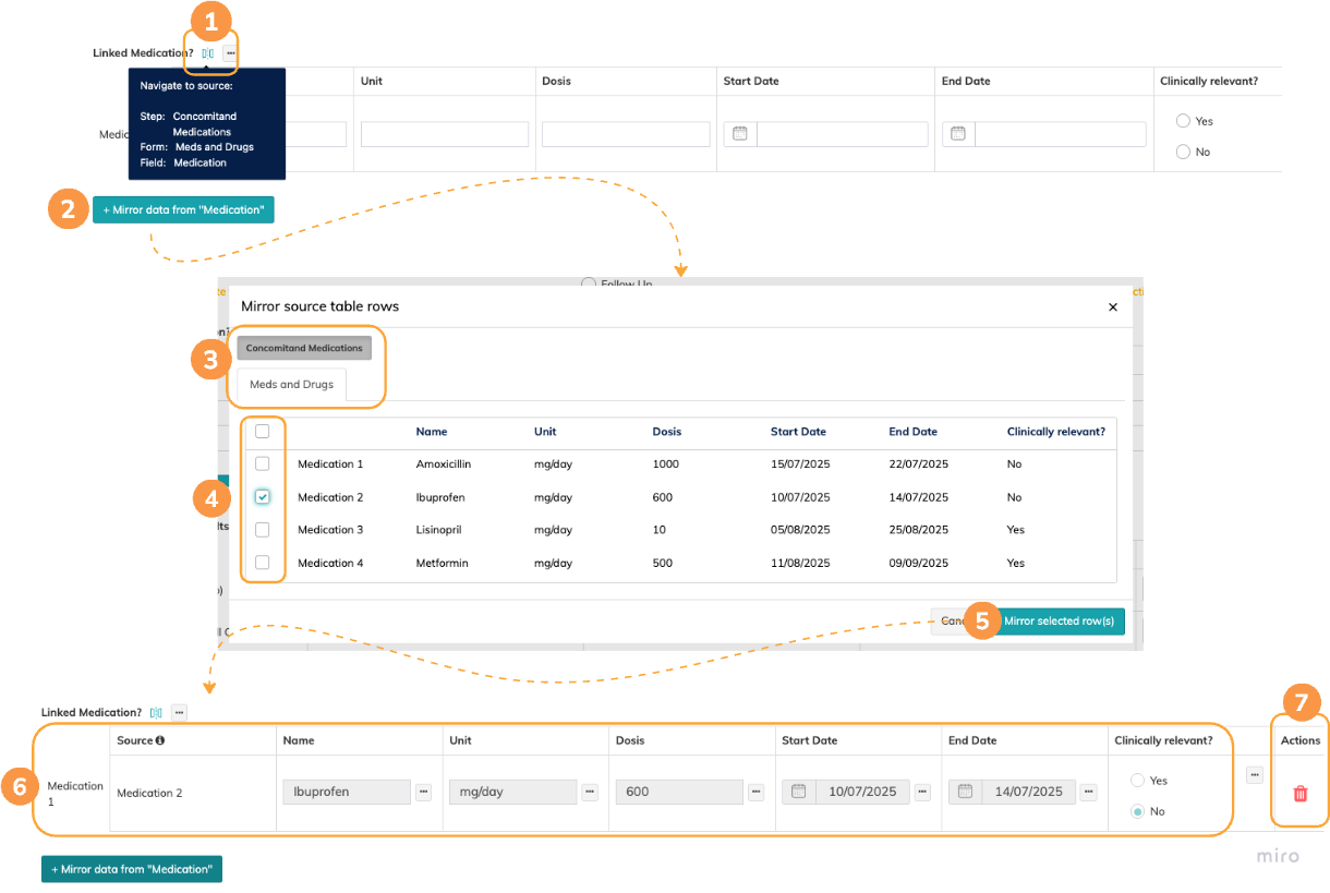 ![]() | You can remove mirrored rows from the (S)AE form at any time. ⚠️ Important: Removing a mirrored row only unmirrors the data. The original entry in the source table remains unchanged. |
