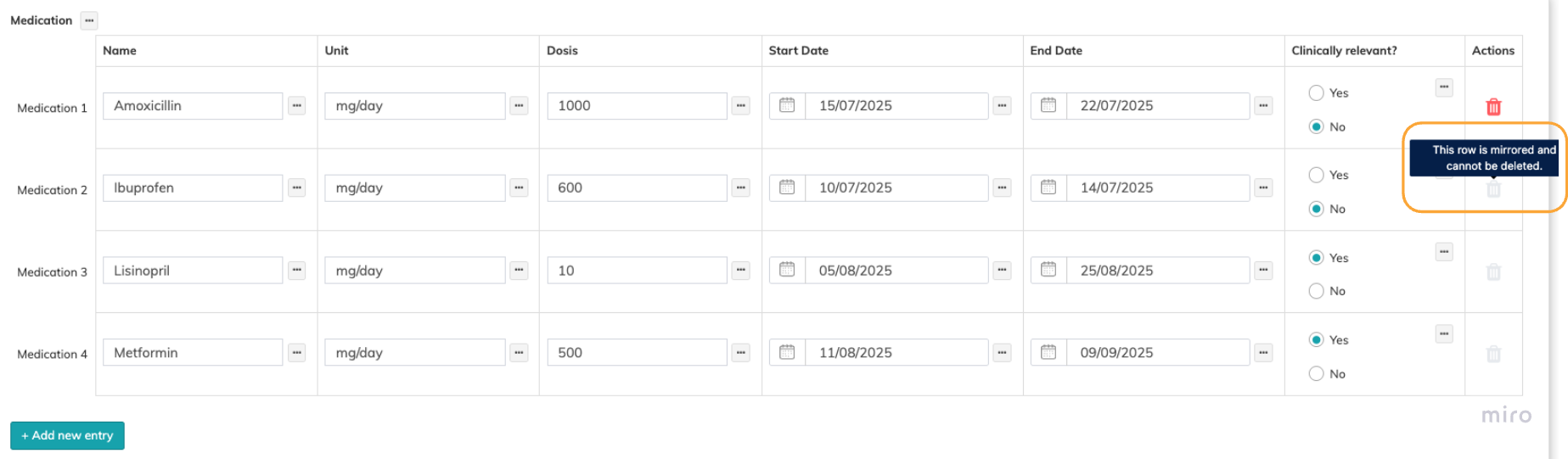 ![]() | To mirror data, click into the table or use the button “Mirror data from {{source table}}” (e.g. “Mirror data from Medication”). A popup with available rows will appear. |