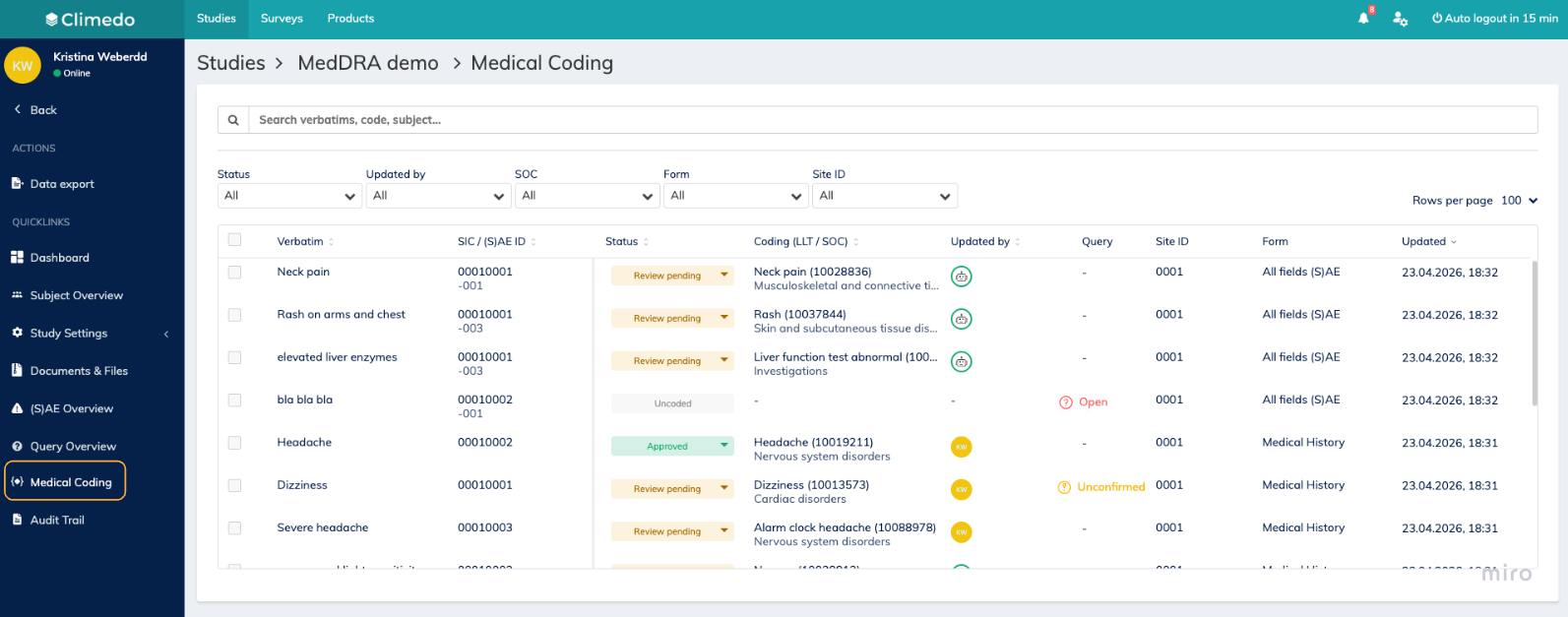 - Coding (LLT / SOC) — the LLT name with its numeric code in brackets on the first line, and the SOC name below it. Empty ("—") if the verbatim is not yet coded.
