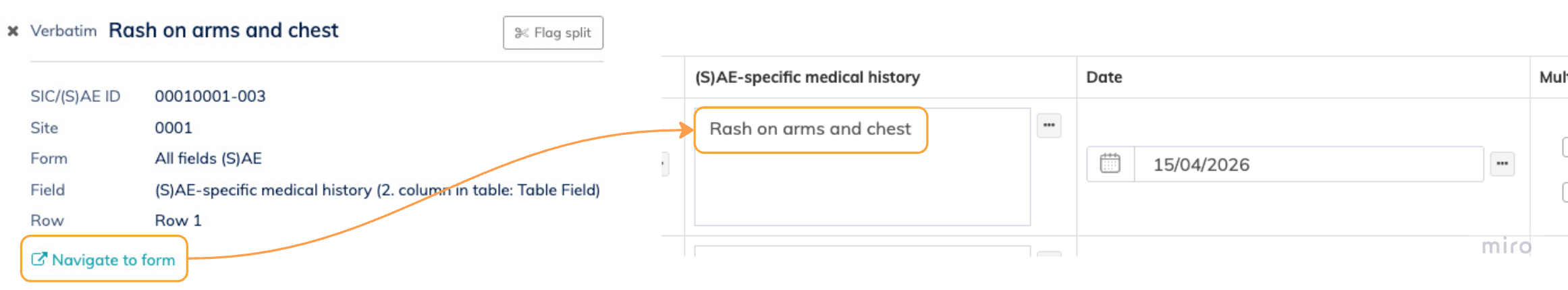 - Context metadata — SIC or (S)AE ID, Site, Form (with the step name for scheduled events), Field (including the column index and column label when the field is a table column), and Row label (for table rows). A Navigate to form link opens the source form in a new tab (see Section 3.4).